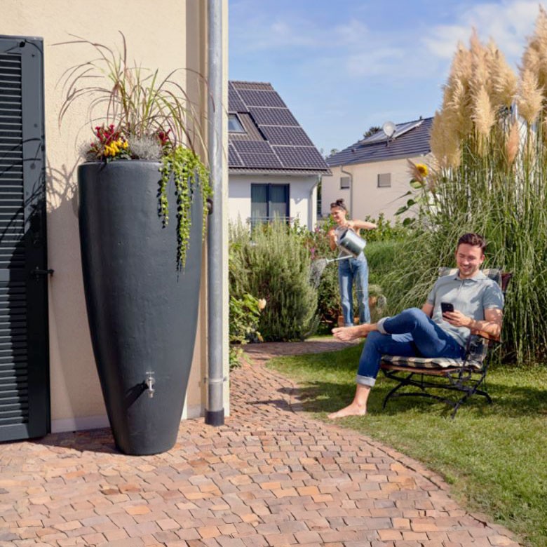 Plastová dekorativní nádrž na dešťovou vodu Aare o objemu 300 litrů je praktický a zároveň designový doplněk na Vaši zahradu. Nádrž zachytává dešťovou vodu ze střechy domu a umožňuje tak využívat přírodní zdroje i v období sucha a šetřit tak rodinný rozpočet.
