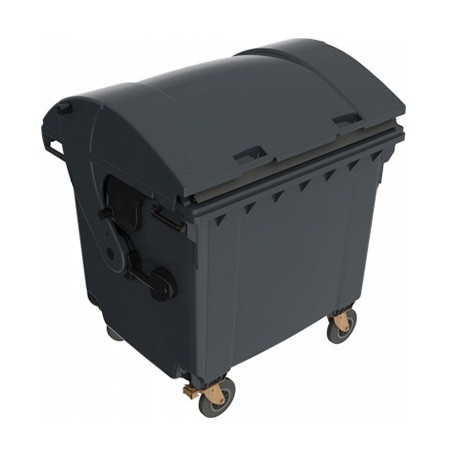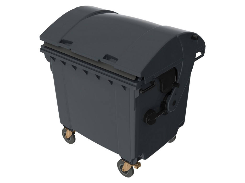 Plastové kontejnery 1100 l na komunální odpad na čtyřech kolečkách a s dětskou pojistkou proti samovolnému zavření víka. Celopryžová kolečka jsou otočná, dvě navíc bržděná.