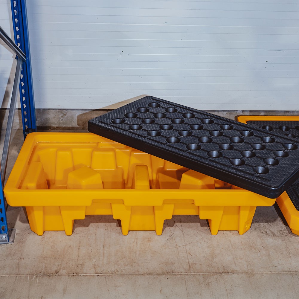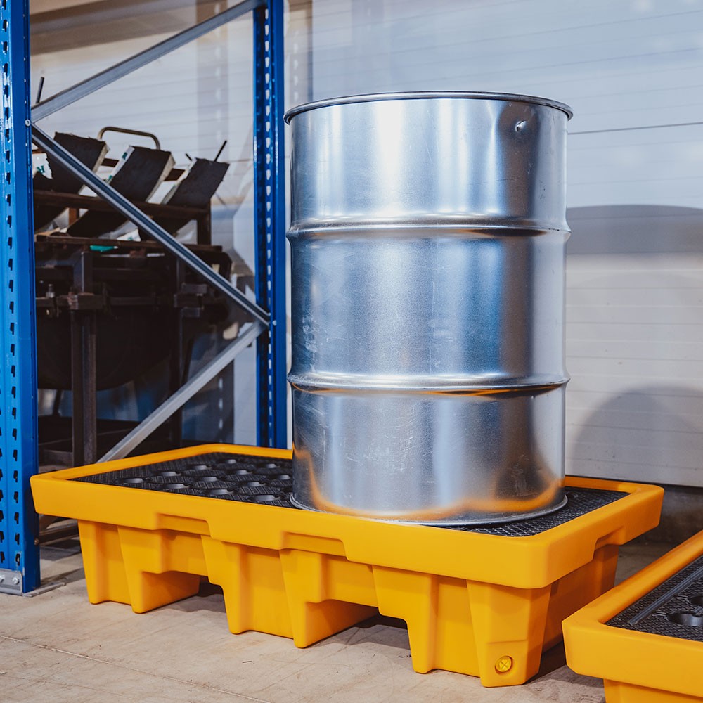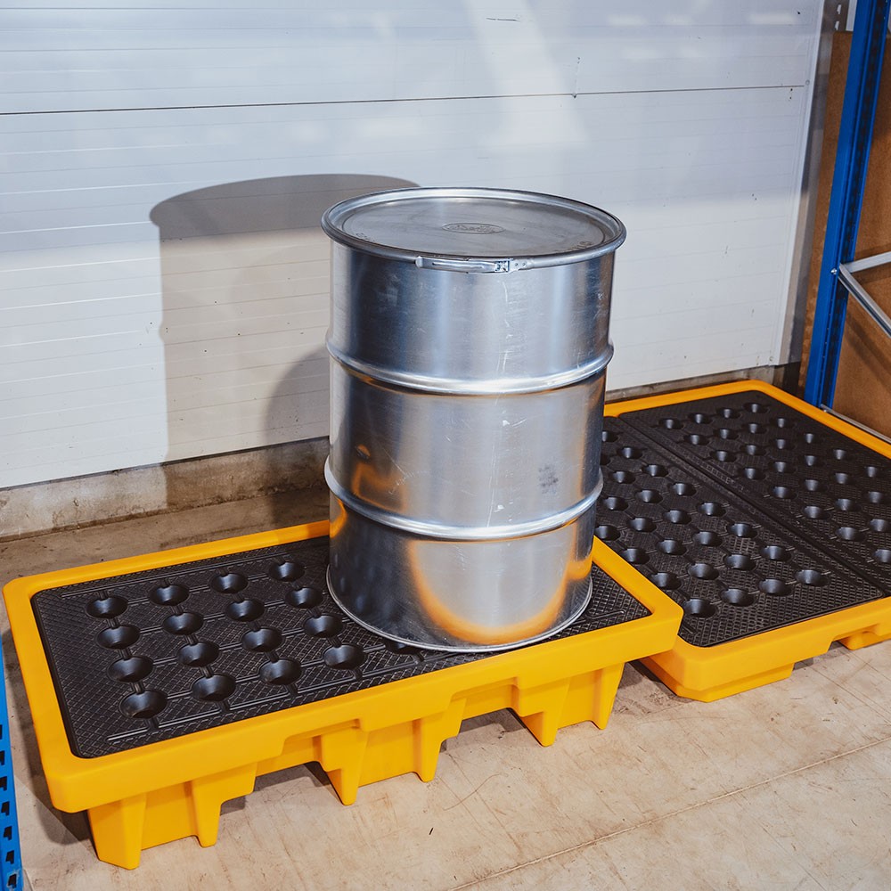 Plastová záchytná vana/plastová paleta s roštem pod 2 sudy.